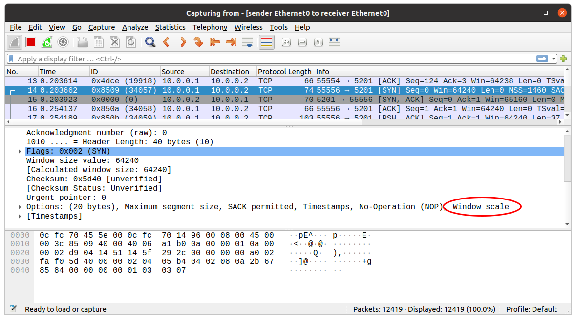 Let's look at the wireshark. You'll see the initiator sent a syn with window scaling but the other side doesn't support it so no window scaling was negotiated.